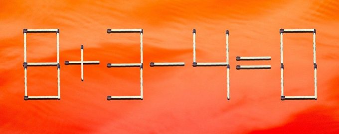 Μπροστά σας υπάρχει ένα παράδειγμα 8+3-4=0=0, το οποίο είναι προφανώς λανθασμένο. Μπορείτε να μετακινήσετε μόνο ένα σπίρτο για να κάνετε το πρόβλημα να βγάλει νόημα. Σύμφωνα με τους κανόνες τέτοιων γρίφων δεν μπορείτε να αφαιρέσετε ραβδιά από το σύμβολο “=” ή να το διαγράψετε, αλλά μπορείτε να αλλάξετε οποιαδήποτε άλλα σύμβολα και αριθμούς.