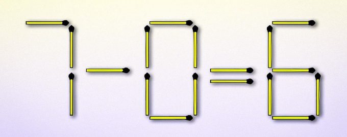 Μπροστά σας λοιπόν βρίσκεται μια λανθασμένη ισότητα: 7 – 0 = 6. Αποτελείται από 18 αντιστοιχίες. Δύο από αυτά πρέπει να μετακινηθούν και η ισότητα θα γίνει σωστή. Σημαντικό: έχετε μόνο 20 δευτερόλεπτα για να λύσετε το πρόβλημα.