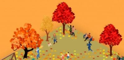 Η εικόνα απεικονίζει μια φθινοπωρινή παιδική χαρά όπου άνθρωποι και παιδιά περπατούν. Ο καθένας είναι απασχολημένος κάνοντας το δικό του πράγμα, αλλά δίπλα σε κάποιους από αυτούς βρίσκονται οι κολοκύθες που ψάχνουμε.
