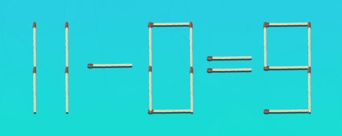 Έτσι, μπροστά σας – μια λανθασμένη ισότητα: 11 – 0 = 9. Αποτελείται από 19 σπίρτα. Αν μετακινήσετε ένα από αυτά, η ισότητα γίνεται σωστή. Το έργο μπορεί να γίνει πιο δύσκολο, περιορίζοντας την εκπλήρωσή του σε συγκεκριμένο χρόνο, για παράδειγμα 15 δευτερόλεπτα.