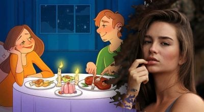 Στην εικόνα βλέπουμε ένα ρομαντικό δείπνο ενός ερωτευμένου ζευγαριού. Ο άντρας και η κοπέλα κάθονται στο τραπέζι και κοιτάζονται με θαυμασμό.